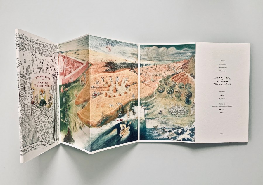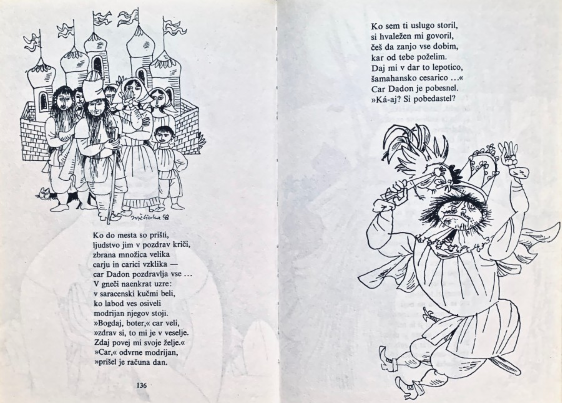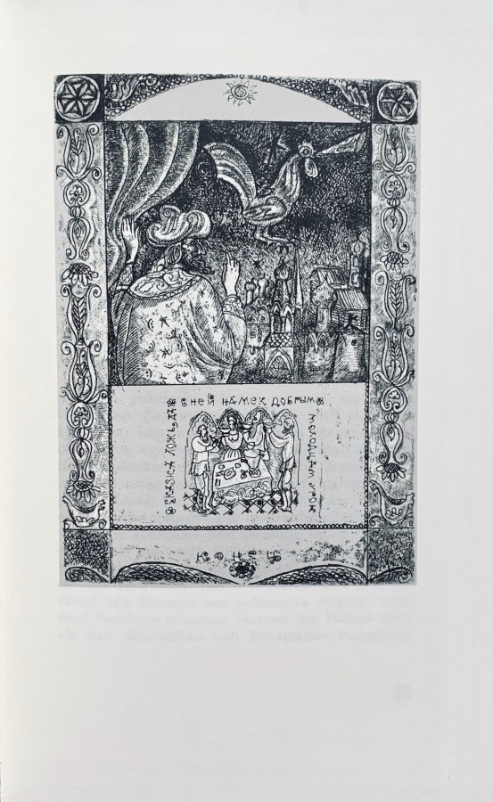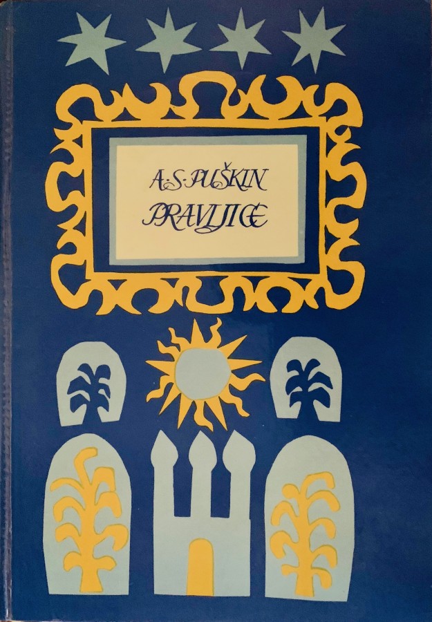 Книга из Югославии времён позднего социализма. Югославская графика мне представляется самой гротескной и шутовской из всех восточно-европейских школ. Может, это позднейшее влияние фильмов Кустурицы. Но всё-таки царь Дадон, ковыряющийся в носу — это свежо. И невинная шамаханская царица с печальными глазами выглядит стёбом.
