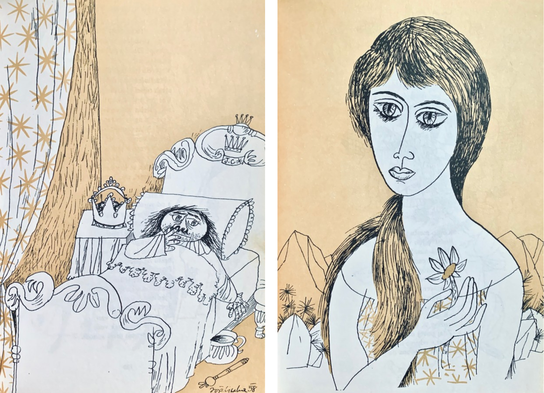 Слева — толстенький царь Додон вглядывается в Золотого петушка на спице. Цветная картинка в традиционном духе, вполне могла принадлежать кисти русского (советского) художника. Справа — чёрно-белый рисунок. Какой-то утрированный русский боярин (видимо, Гришка Распутин) длань свою простёр над петушком. Понимаем: это маркер русской экзотики для американского читателя. А по существу понятно, что это Звездочёт — причём изображение его в виде дьявольского отродья допустимо как одно из прочтений пушкинской сказки.