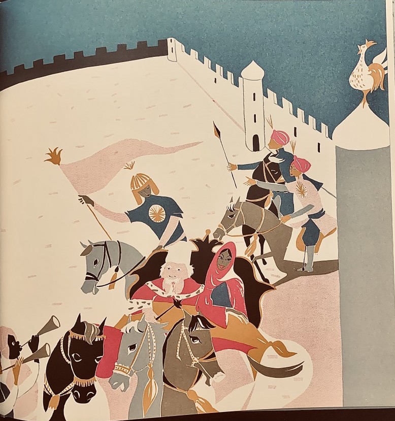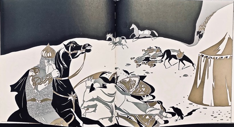 А вот прочтение сказки оригинальное. В наших иллюстрациях к "Золотому петушку" закрепились билибинские штампы: царь пеший воет над убитыми сыновьями. А здесь — воет, не сходя с коня.