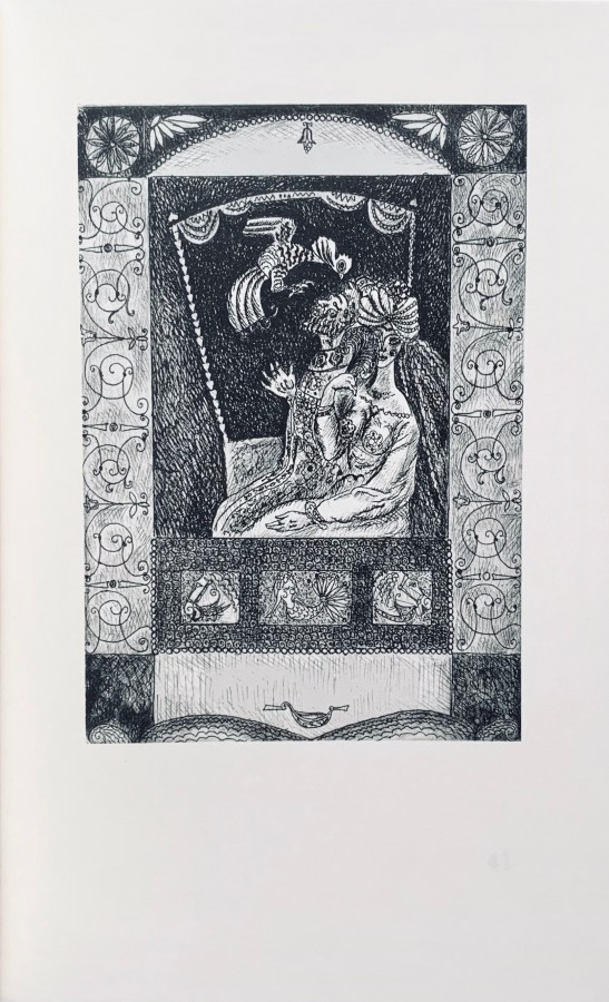 К 1950 году интерес к стилю модерн угас. Дюлак, конечно, пережил своё время. Но радует, что он всё-таки был востребован до конца жизни, избежал судьбы Кая Нильсена. А, может, иллюстрации к "Золотому петушку" были случайным заказом (от иллюстрирования-то Дюлак к тому времени давно отошёл, последние 20 лет марками и конвертами занимался). Есть старинный русский поэт с его восточной сказкой (для англоязычного читателя связь "Золотого петушка" с "Легендой об арабском звездочёте" Ирвинга лежит на поверхности). А тут вдруг такой же архаичный художник, который в начале века прославился иллюстрациями к сборнику сказок «Тысяча и одна ночь»...