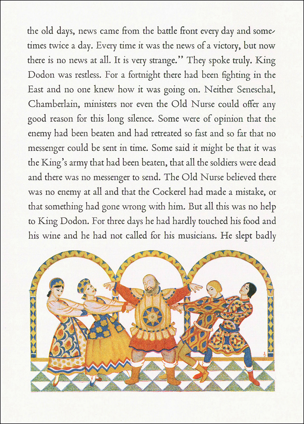 У Пушкина сказка начинается с тревог одряхлевшего царя, но ладно: по сравнению с будущими испытаниями, в начале сказки Дадон, можно сказать, сибаритствовал. Вводится новый персонаж: царская нянька Дуня (Dunya) — она и на картинке изображена. Такие вольности настораживают, но пока не сильно напрягают — видать, няньку вводят во всех американские пересказы (наверное, такой закон). Пока что ещё верим, что перед нами сказка Пушкина.