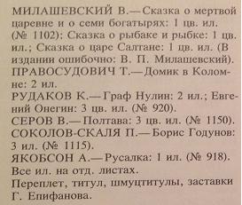 По художникам. В каталоге-справочнике отражены только художники, рисовавшие собственно иллюстрации к произведениям. Однако в этом издании имеются и некие биографические зарисовки — места и пейзажи, связанные, как показалось редакторам, не с произведениями Пушкина, а только с его личностью. Границу иногда сложно провести — так, в корпус "Онегина" включена зарисовка Летнего сада. Художник — знаменитый в своё время Л.Хижинский.