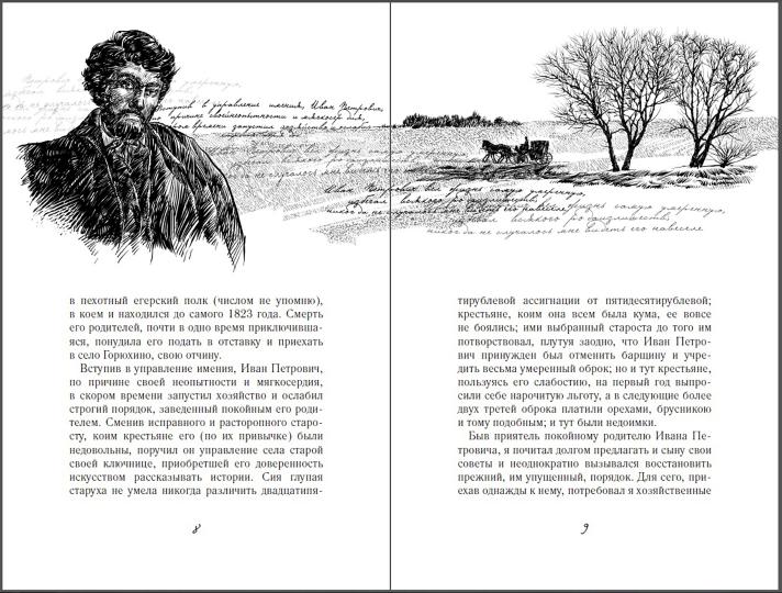 "Повести Белкина" иллюстрированы скупо: по одной страничной иллюстрации и концовке. Но к вступлению "От издателя" такой же расклад, без дискриминации. Эти иллюстрации по содержанию вроде бы уже привычные: Белкин в деревне и деревенские дали. По форме, конечно, неповторимые забирохинские.