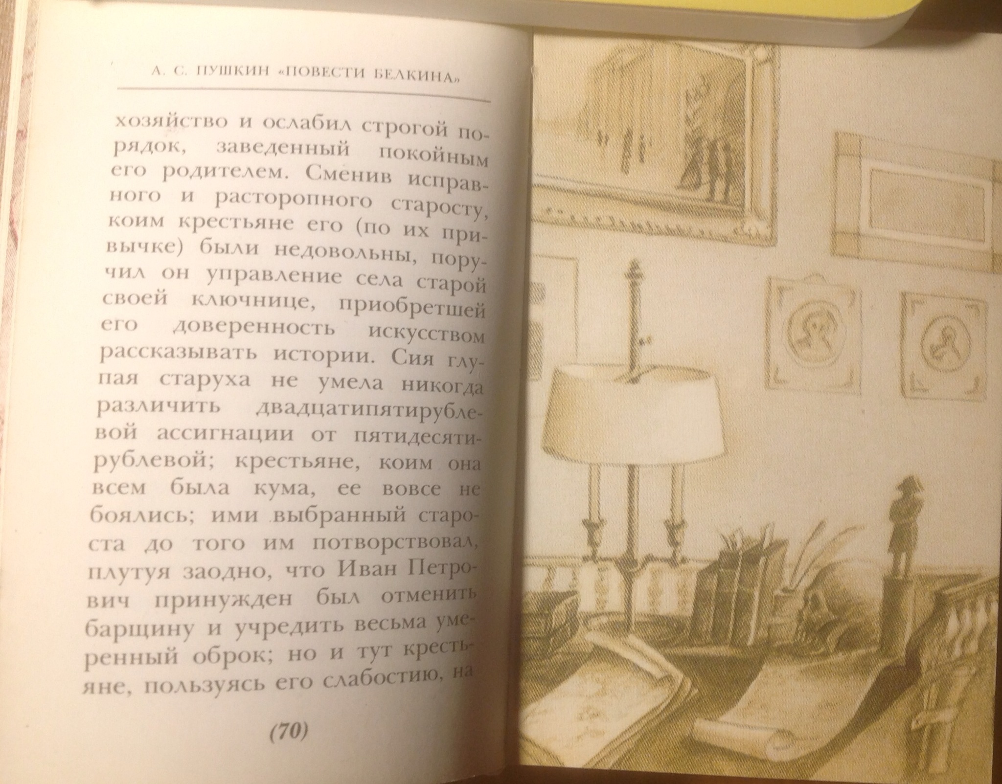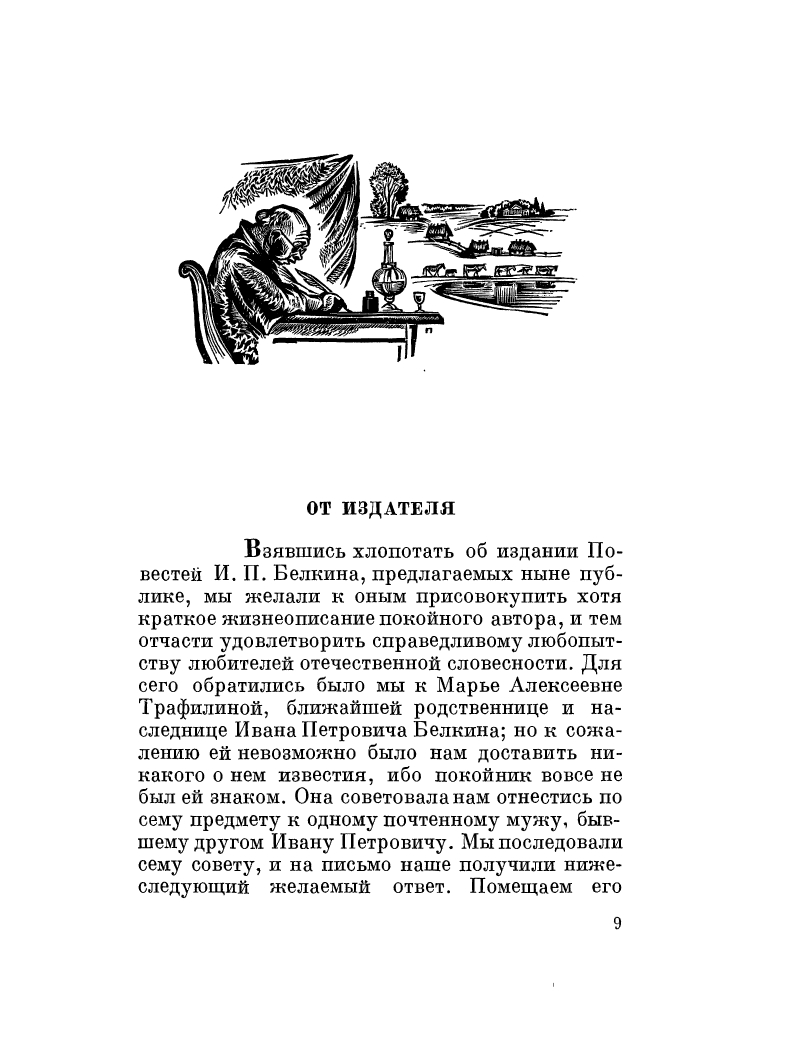 Заставка к вступлению. Кстати, кто на этой заставке? Не Пушкин, но ведь и не Белкин: Белкину меньше 30 лет было, а на картинке явно очень пожилой человек. Это соседний помещик, который пишет Пушкину про Белкина! Ведь письмо соседа и составляет содержательную часть предисловия "От издателя". Не каждому художнику удалось распутать эту тройную шалость: Пушкин-Белкин-сосед.