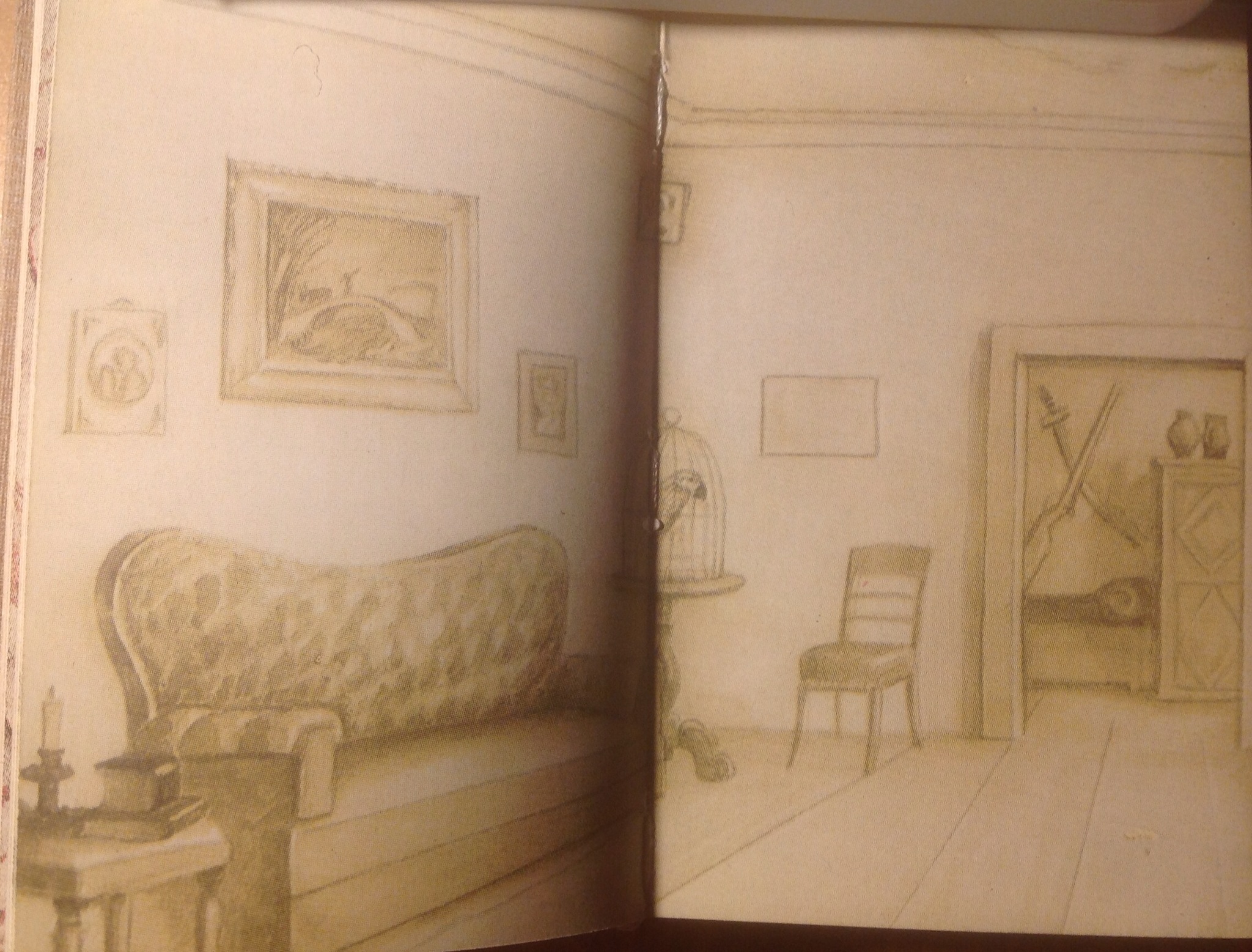 Видимо, и каталог путается. Первая и последняя иллюстрация в этом ряду из панорамы, вроде бы, выбиваются. Хотя это можно представить как подлинную панораму для узкой комнаты, где надо головой крутить: вид слева, вид прямо (там уже законы перспективы), вид справа. Не захотели советские издатели уникальную миниатюру сделать или советская технология уже не позволила?