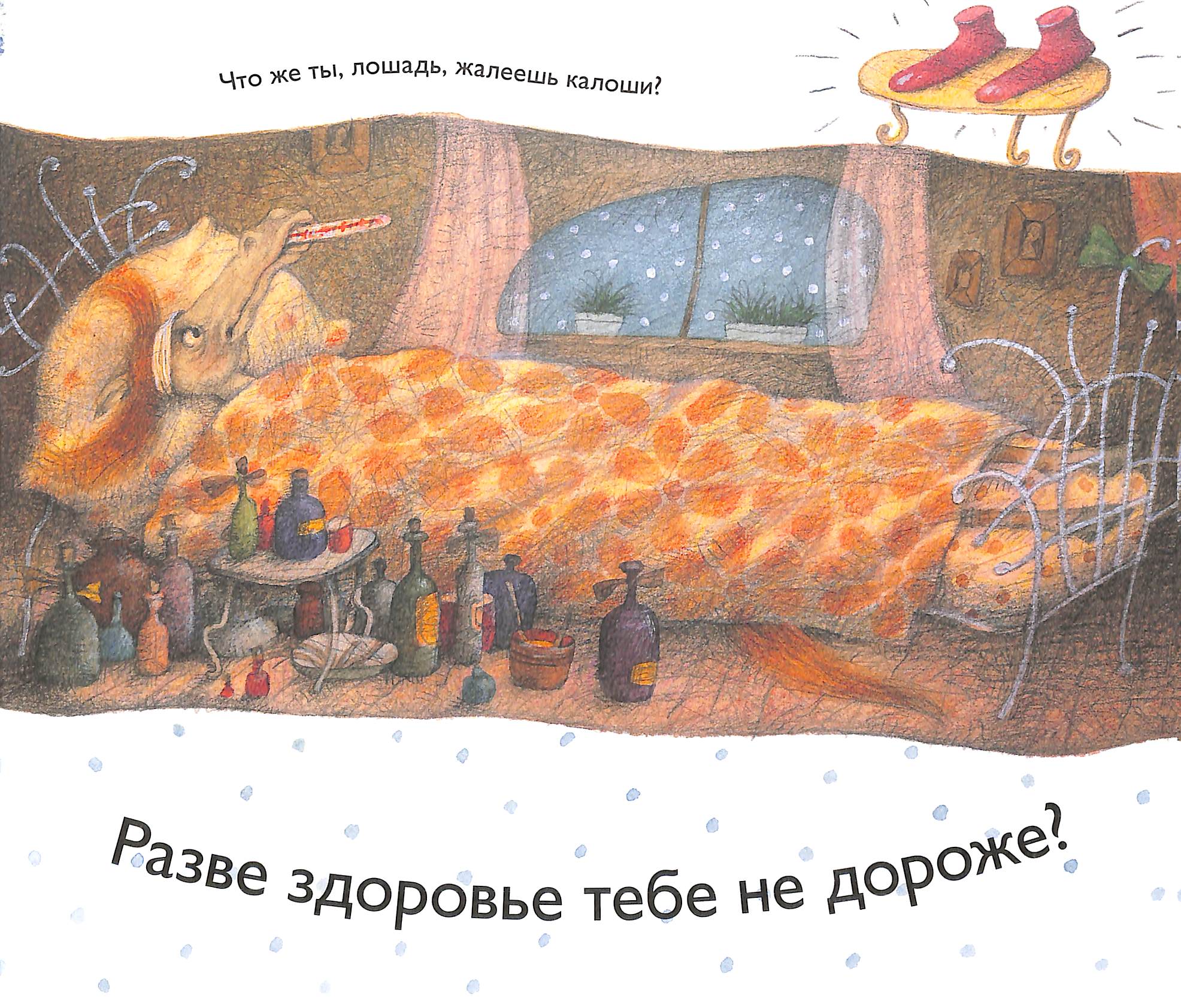 У Антоненкова, как ни странно, повторена в рисунках идея Калачёва: вот лошадь гуляет (в галошах поплоше), вот она тяжело болеет. Болеет долго — за окном уже снег, лекарства всё прибавляются (предыдущие, значит, не помогли), следов пенициллина опять не вижу. Бедная глупая лошадь.