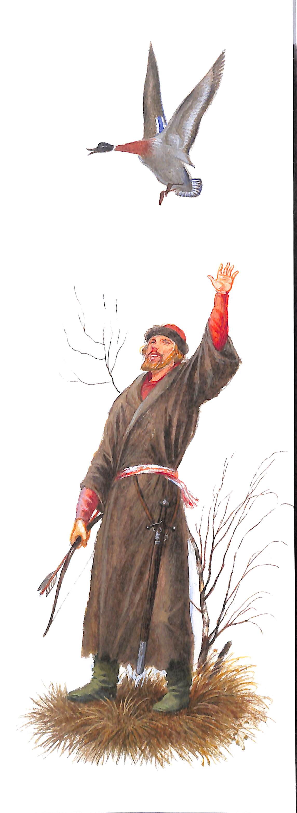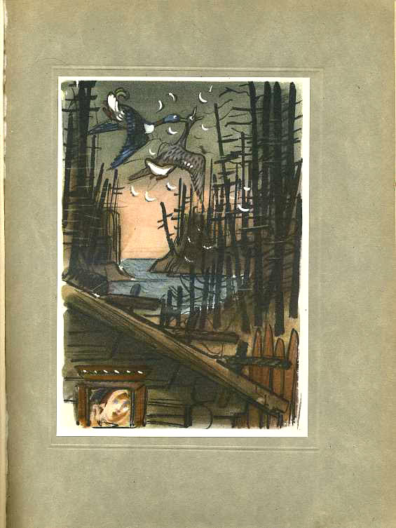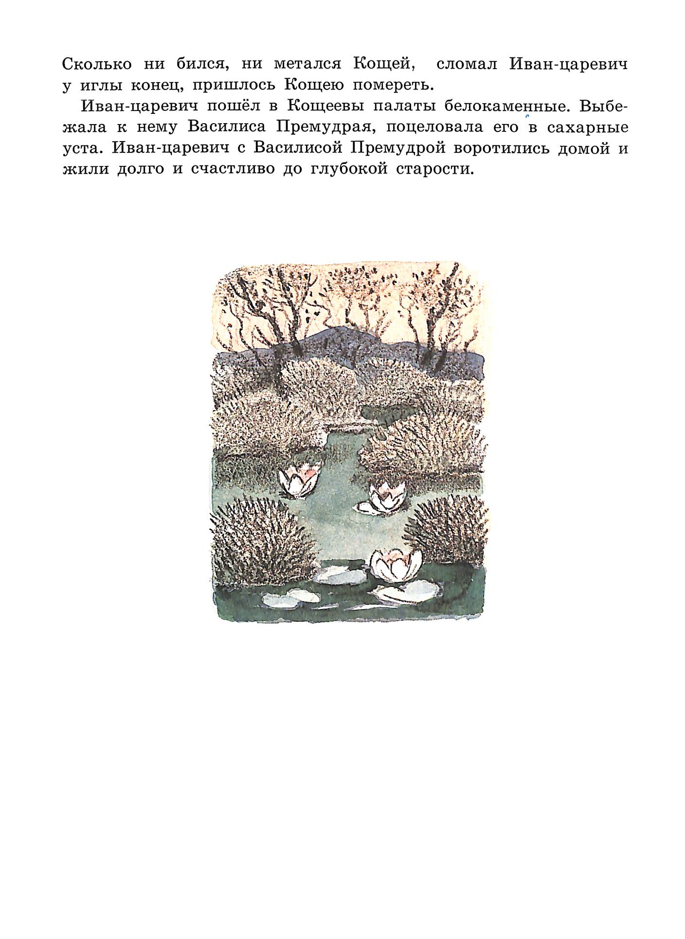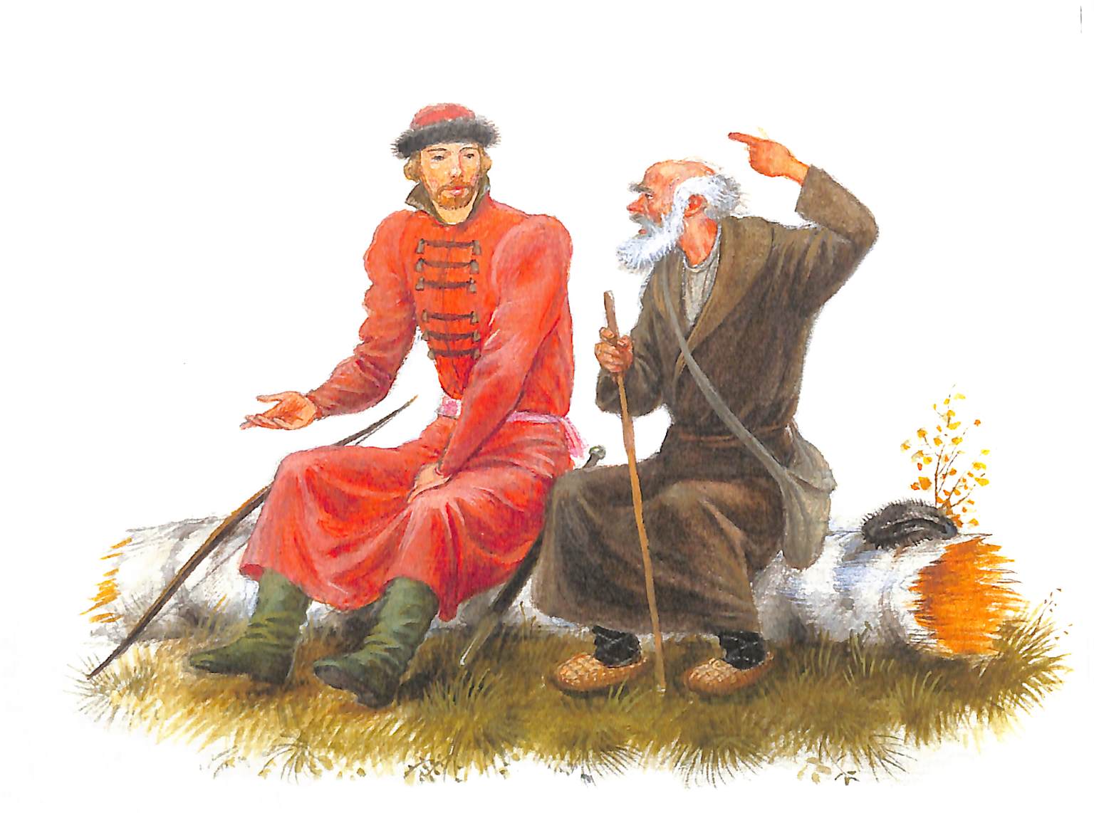 Иван-царевич пощадил селезня. Осень уже поздняя: трава пожухла, деревца голые. Сам Иван-царевич накинул на свой красный кафтан что-то сермяжное (такое было на старичке надето, надеюсь царевич старичка не обобрал).