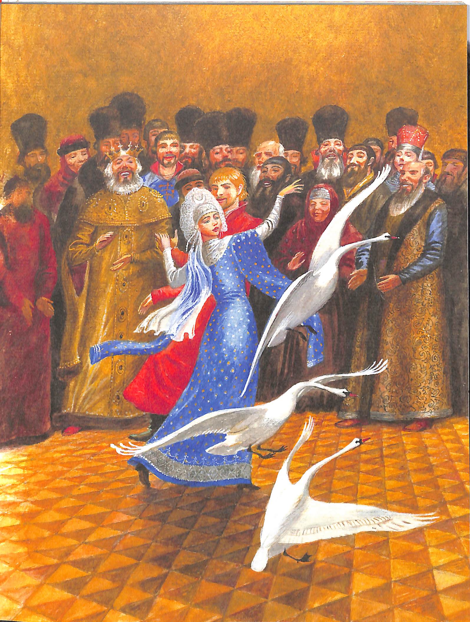 Рисунок в стиле русской миниатюры из книги: "Русские сказки: Книга для чтения с комментарием на английском языке". Иллюстрации М.О.Тесаржиковой. — М.: "Русский язык", 1984.