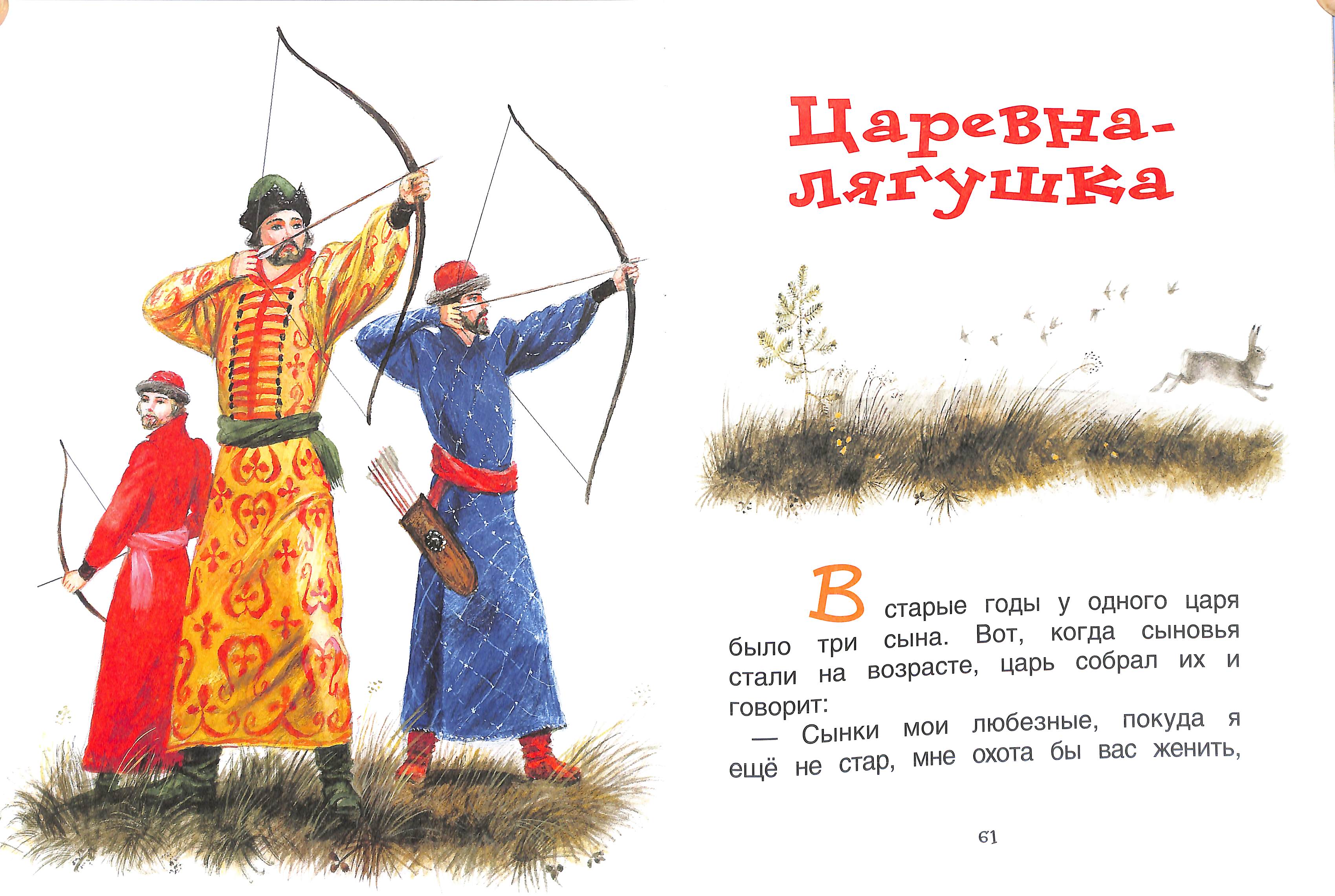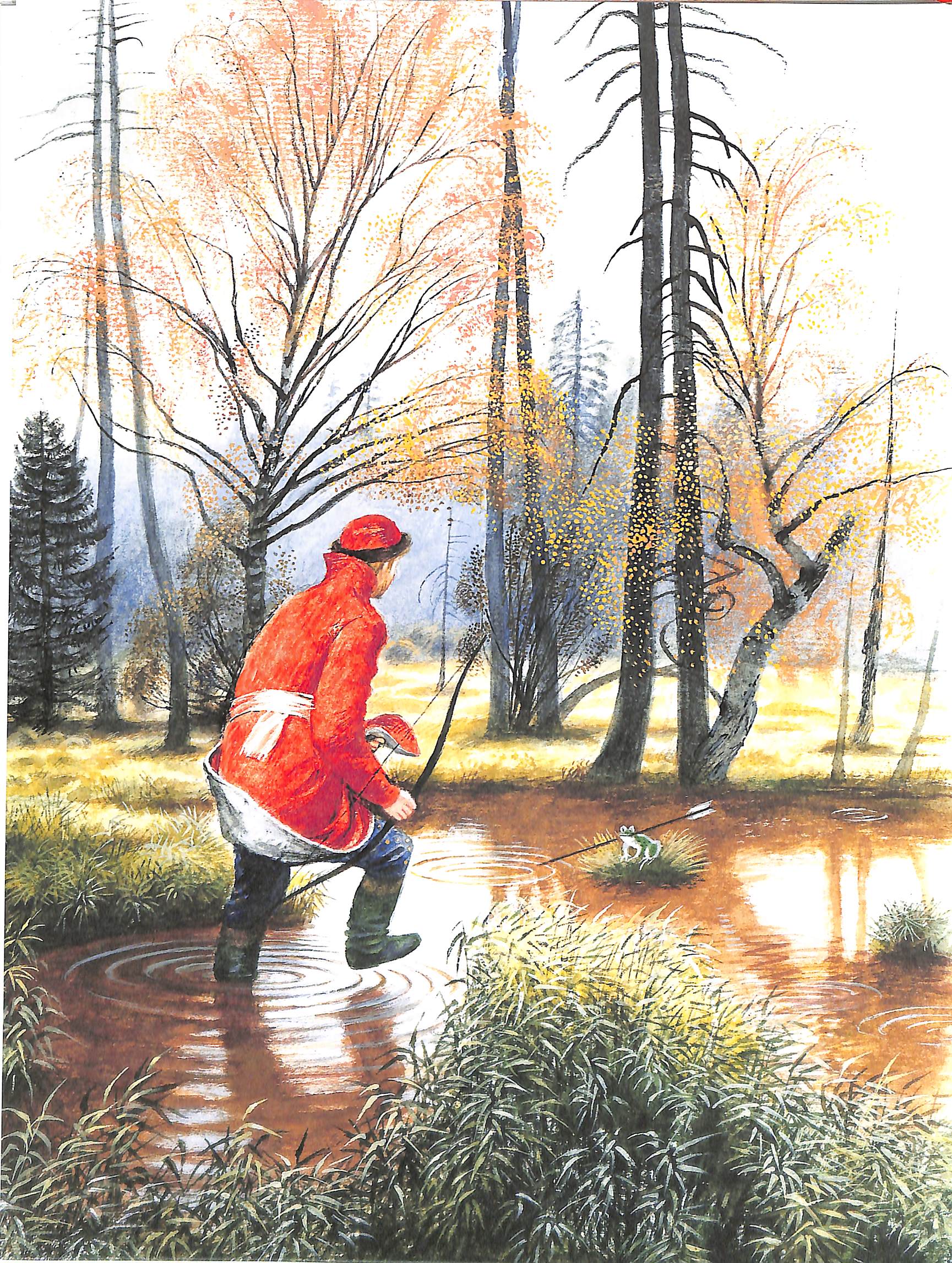 Устинов — мастер русского пейзажа, вставляет в него героев книги. Лягушка держит стрелу в пасти, но в остальном вполне реалистична (без короны).
