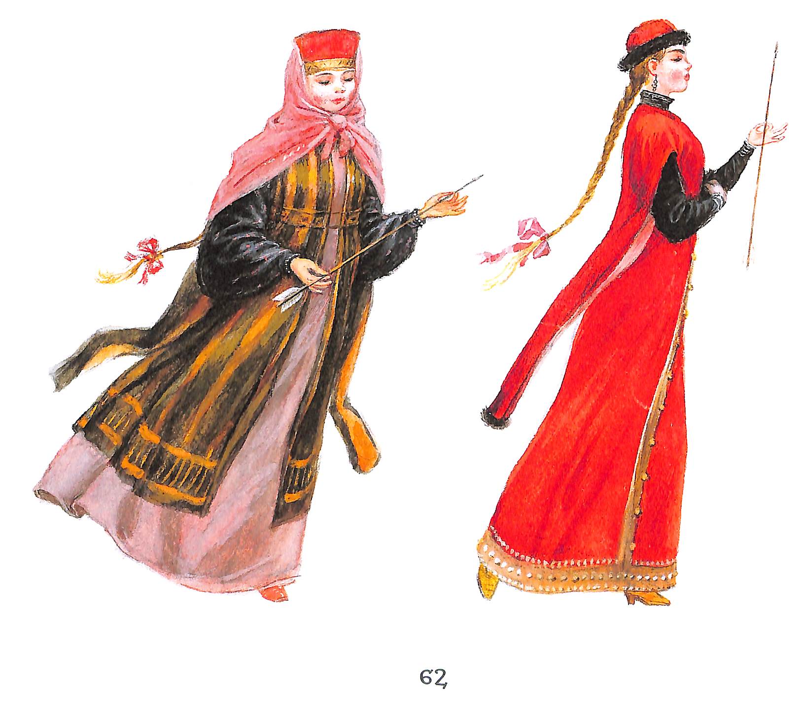 3) Но не зря Рачёв рисовал стольких животных в одежде. Он смог тонко передать и черты животных в человеке. Настоящая удача — это образ Василисы Премудрой в человеческом облике. В её одежде (в головном уборе, особенно) и фигуре есть что-то лягушачье.