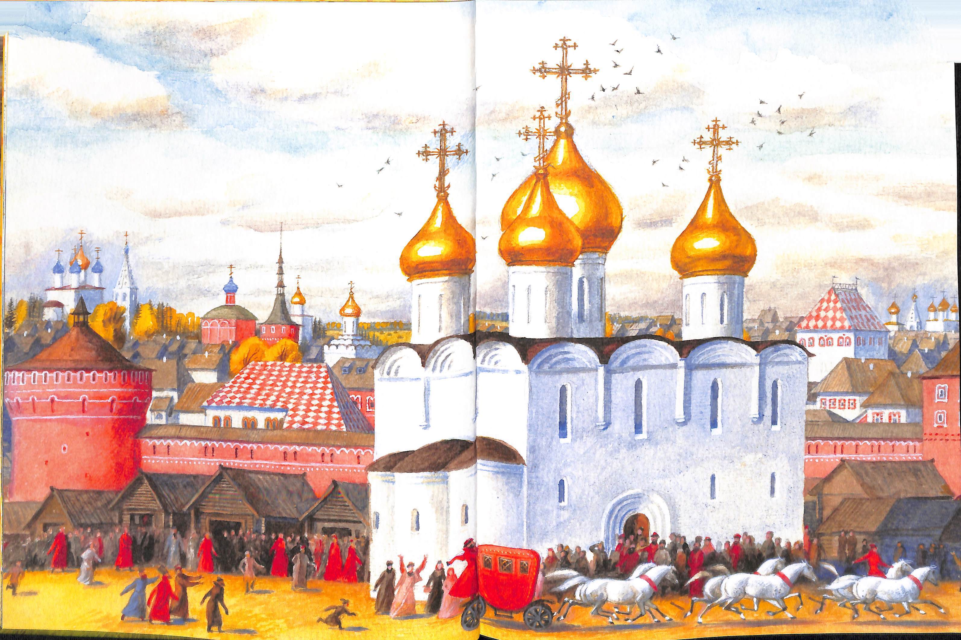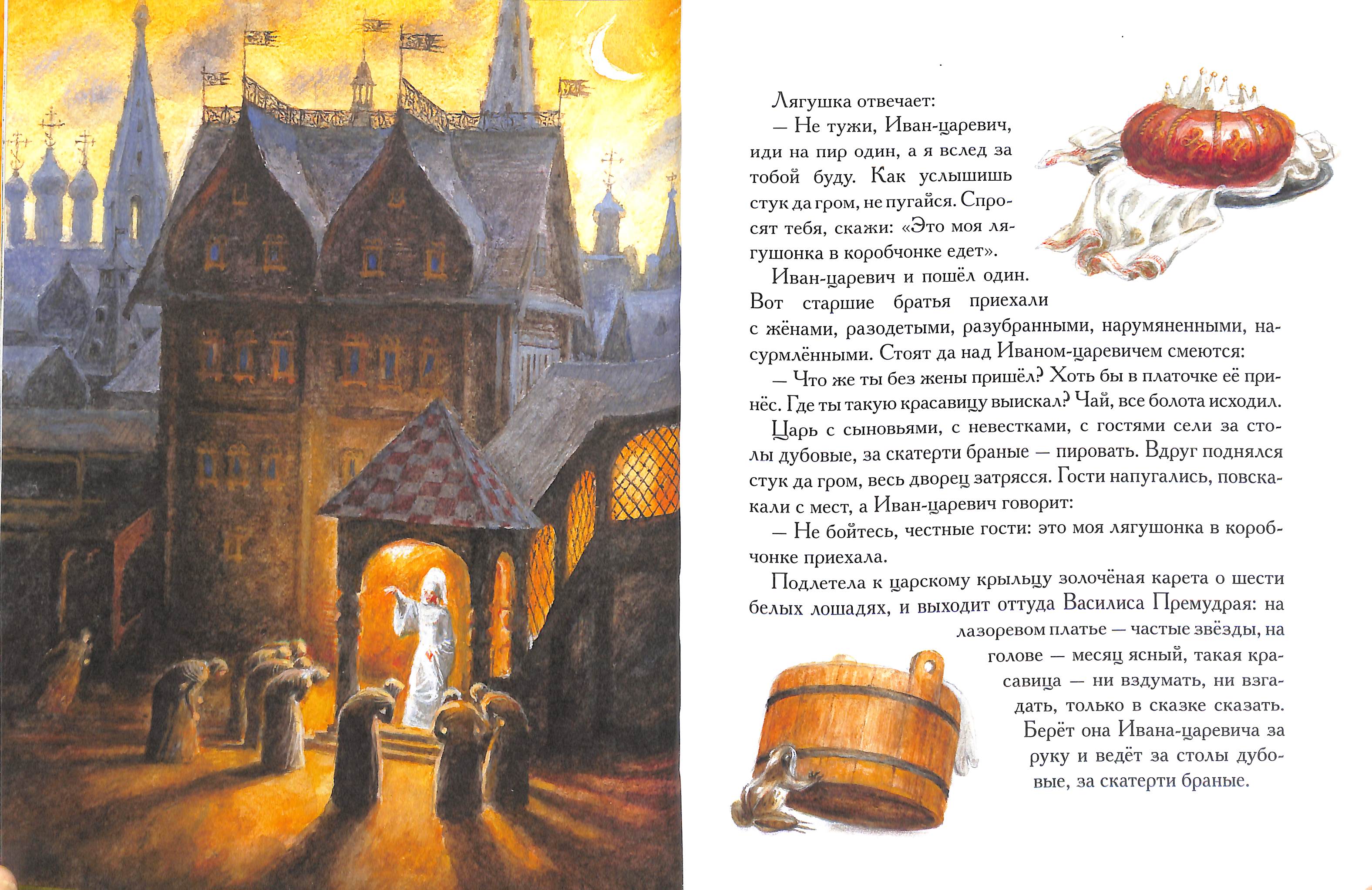 Масштабно мыслит художник: какая панорама города с кремлём и собором! Но может показать крупным планом и "коробчонку, на которой лягушонка приехала".