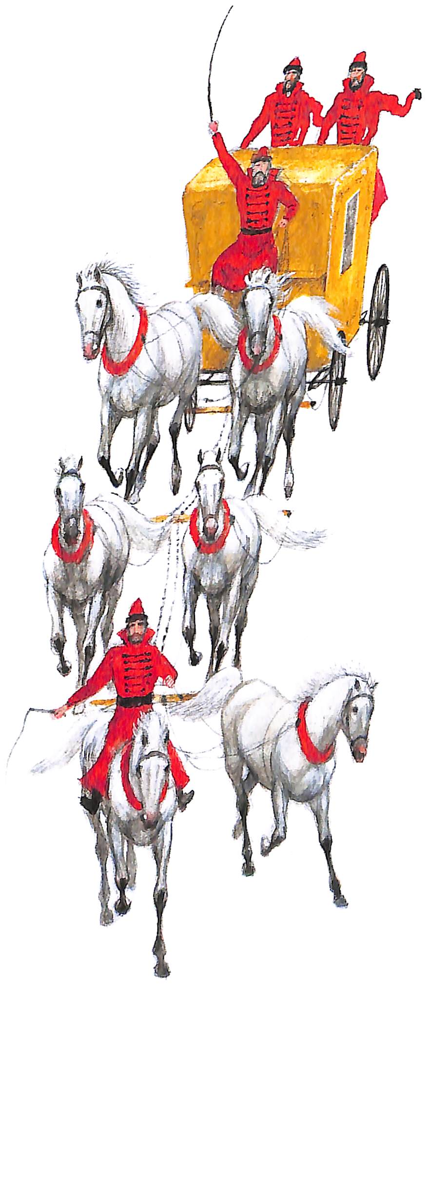К сожалению, у В.Перцова нет сюиты иллюстраций к "Лягушке-царевне". Только открытка из набора "В.В.Перцов. Иллюстрации к русским народным сказкам" (М.: Советский художник, 1988). Открытки слишком засвечены, сканер их совсем бы убил. Сфоткал на планшет, порегулировал контрастность и яркость. Но контуры лошадей всё равно только угадываются. Это Василиса в коробчонке едет на пир. Форейторы в зелёном, и у одного морда прям лягушачья. Хорошие художники сами в игру включались.