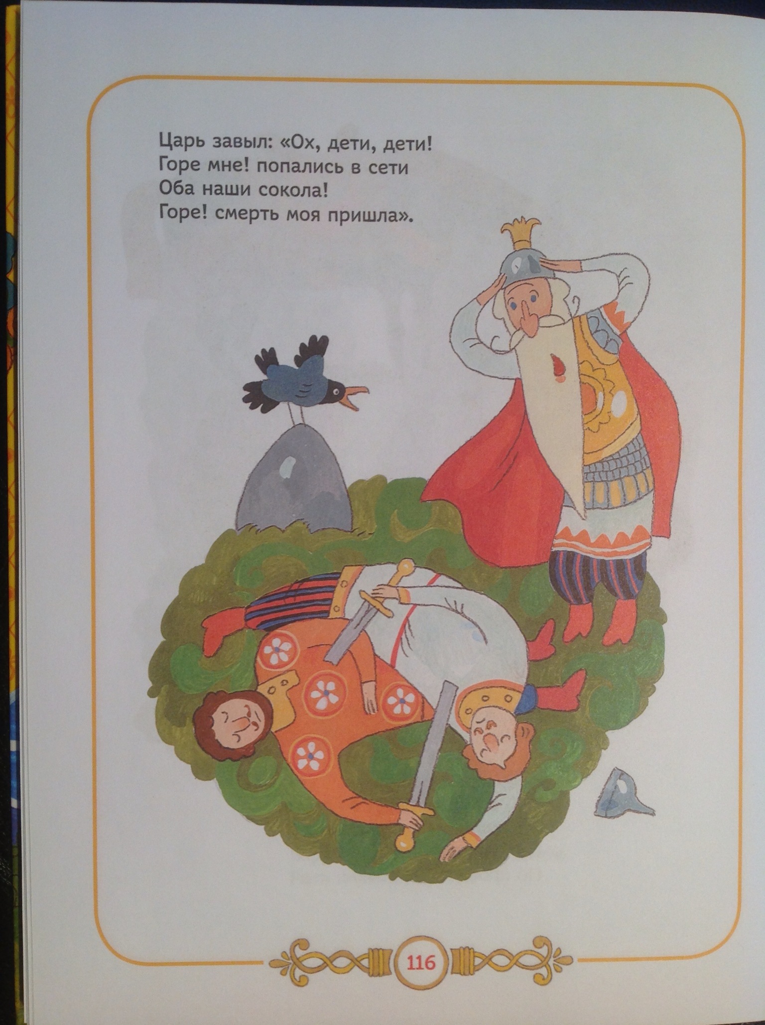 Сюжетные иллюстрации, которые перебивают картинки с холмом — они незлые, с детским юмором: вот, например, царь Дадон наслаждается безопасностью, покачивая ногой в полосатом носке и попивая пиво из иностранной кружки (а собака-то худая, некормленая!).