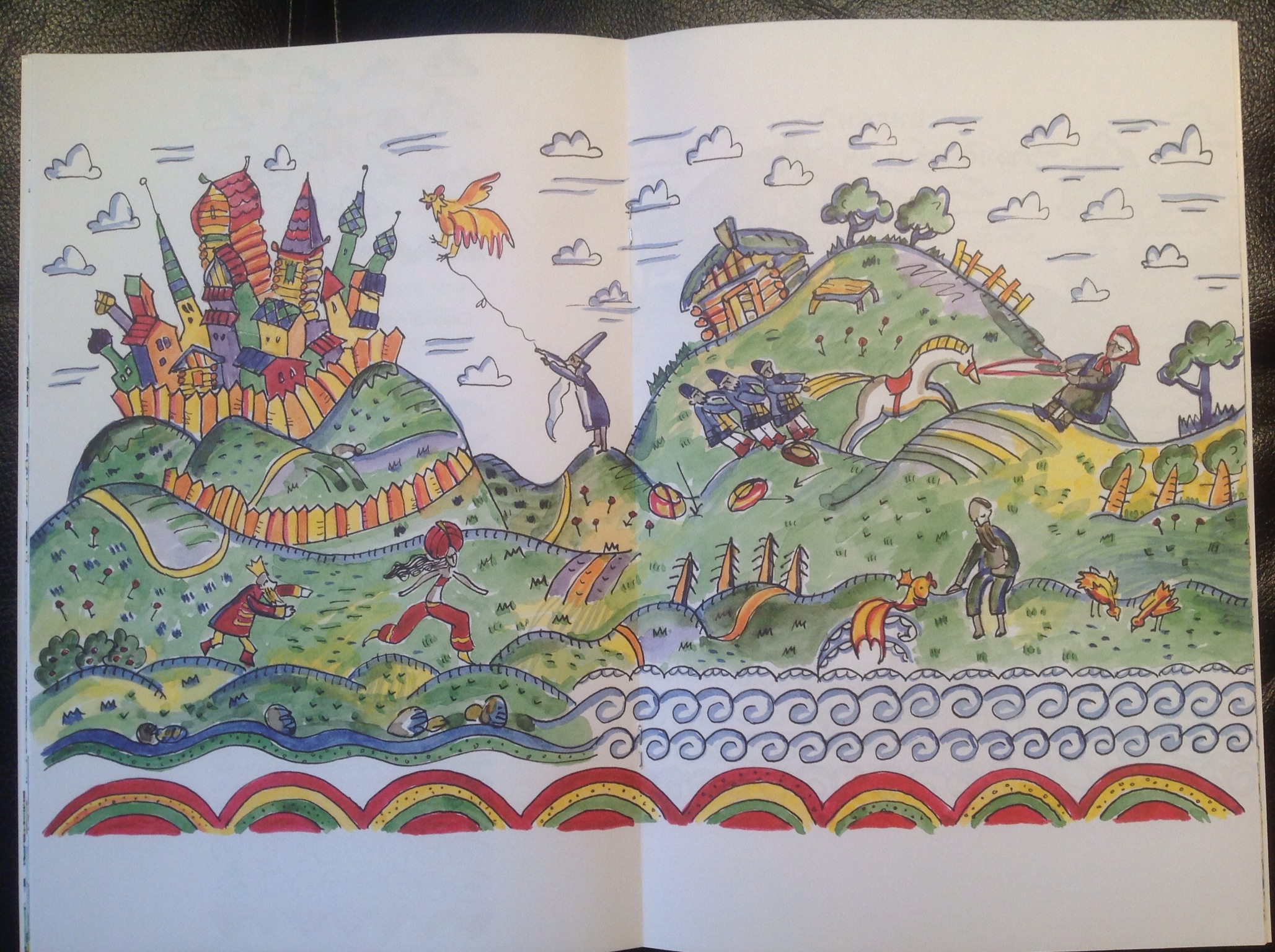 Вот разворот, который делит две сказки. Слева — про золотого петушка, справа — про рыбка и рыбку.