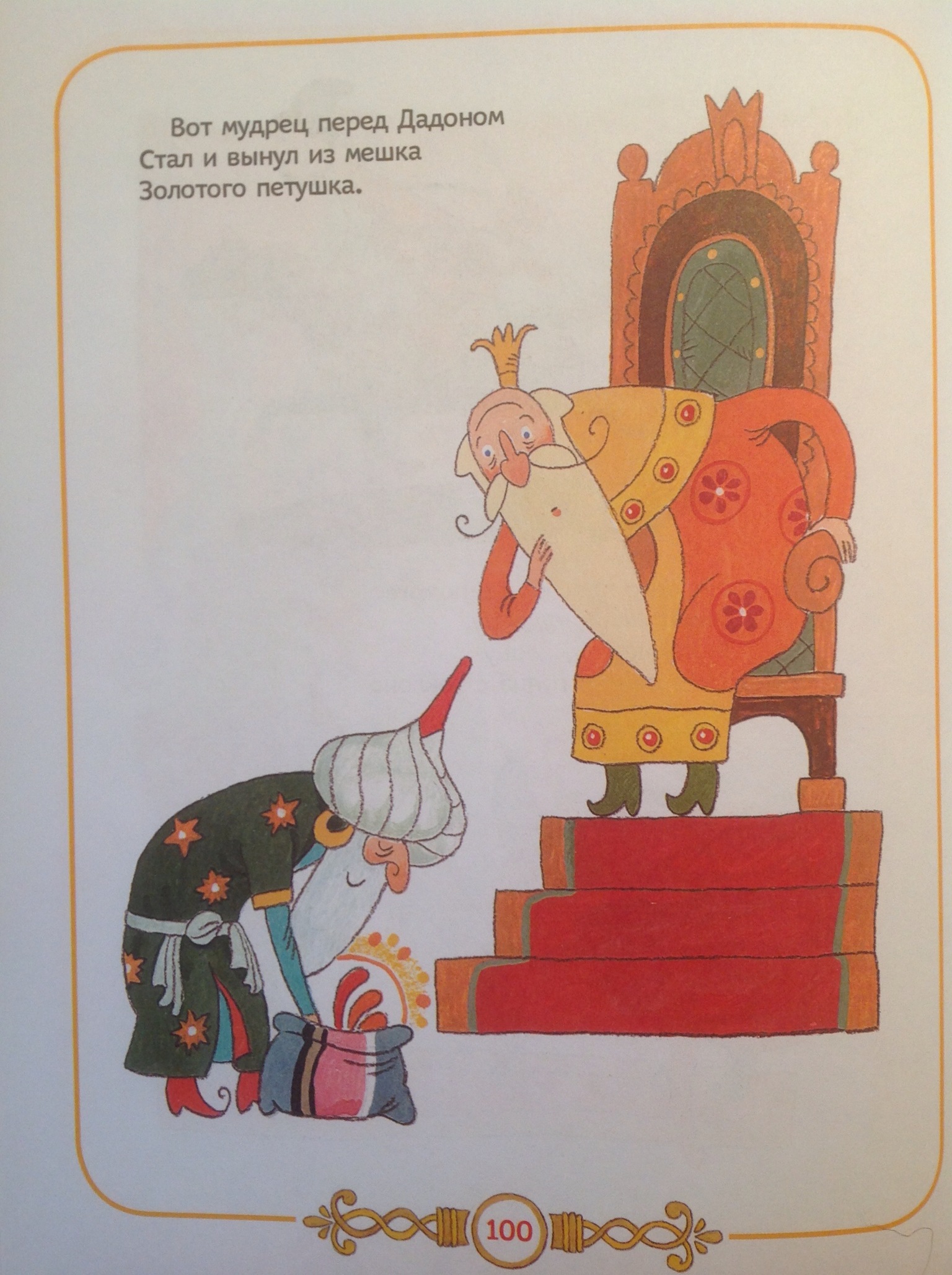 Сказка проиллюстрирована художницей почти построчно. Благодаря этому, появляются даже какие-то новые сюжетные сцены. Например, не забыто, что это Дадон униженно просил скопца о помощи (а не сам скопец навязывал свои услуги).