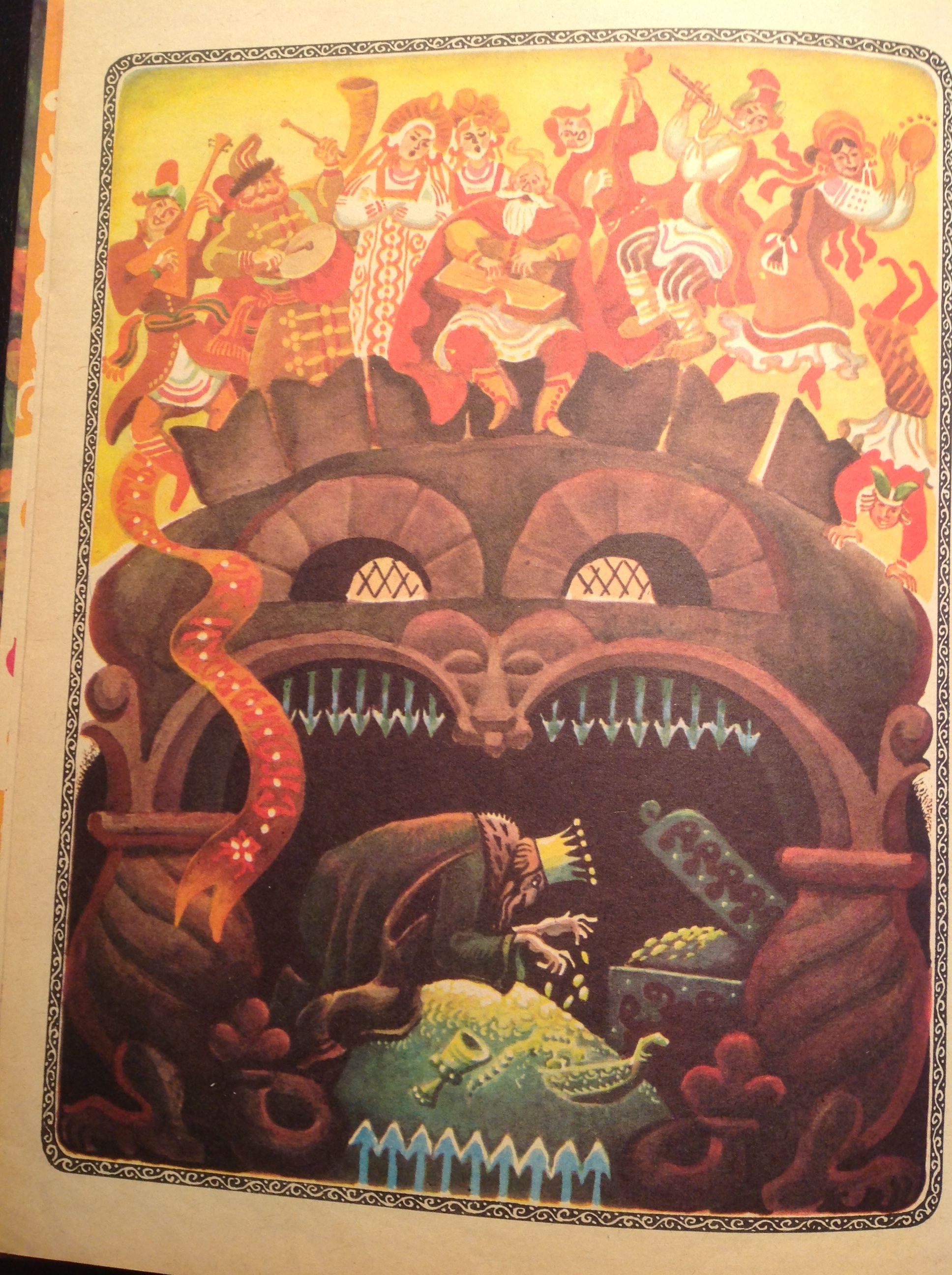 Типичная для тех времён детская иллюстрация: какая многофигурная композиция, какая контрастность — и цветовая, и сюжетная! До чего приятно было ребёнку неторопливо рассматривать детали таких композиций!