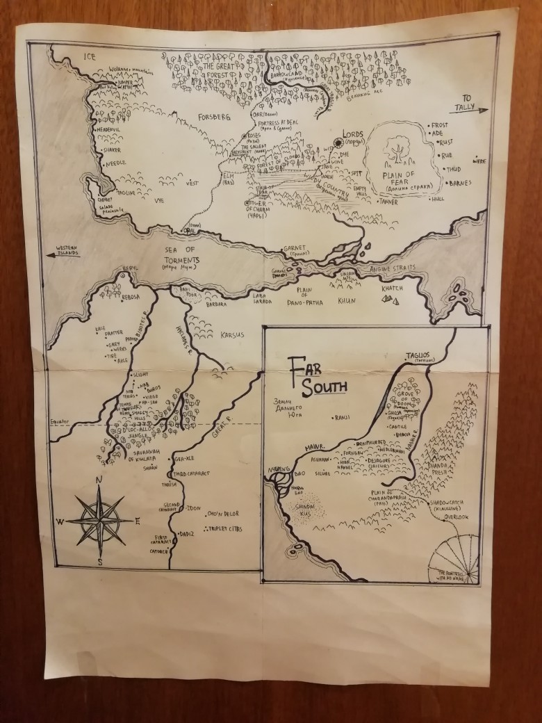 Это карта, сделанная любителями ролевых игр в поле, для ориентирования на местности и привязки местных топографических элементов к игровому миру. Из плюсов — все надписи на русском языке. Из минусов — здесь только фрагмент мира "Чёрного отряда", поскольку разыгрывалось действие из первого романа, на севере.