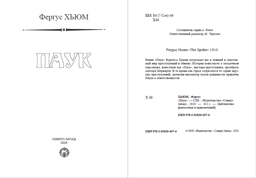Хочу обратить сегодня ваше внимание на одну книгу, которая готовится к выходу в издательстве "Северо-Запад" — "Паук" Фергуса Хьюма.