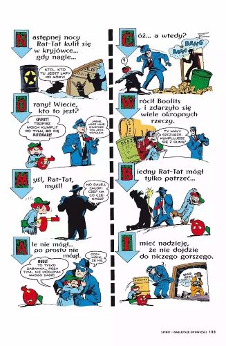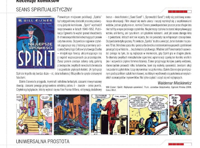 Произведение УИЛЛА АЙСНЕРА – это приключенческая, криминальная история с толикой фантастики, иногда непринужденно шутливая, иногда приправленная частичкой пафосности, но всегда со связным сюжетом. Читатели/зрители, видевшие фильм Фрэнка Миллера, получат дополнительный бонус -- две истории, которые легли в основу экранизации. Фильм получился не слишком удачным и, вероятно, не оправдал ожиданий зрителей, но если бы не он, комикс АЙСНЕРА, вероятно, лишь через многие годы попал бы в руки польских читателей. На первый взгляд, это старое произведение, которое не бросается в глаза ни формой, ни рисунком, ни плоскими цветами. Похоже на сеанс старого кинофильма со звездами, которых никто не узнает, потому что их не показали в топовом журнале. Конечно, это всего лишь видимость. После прочтения «Призрака» трудно поверить, что этому персонажу почти 70 лет. Немного уважения к труду старейшины комиксов позволит читателям погрузиться в историю... без главного героя. Именно так! Феномен этих комиксов в том, что они лучше всего выглядят, когда Призрак маячит где-то на заднем плане. Это драмы обычных жителей огромной агломерации делают комикс великим (ну и, конечно же, прекрасные femmes fatales). АЙСНЕР, исходя из разных точек зрения, равномерно ведет нескольких персонажей, играет с тканью повествования, сюжетными поворотами и чувствами читателей. Произведения АЙСНЕРА — практический учебник по искусству комиксов, на котором воспитывались поколения американских художников и сценаристов комиксов. Ничего не остается, кроме как читать и учиться у лучших учителей.