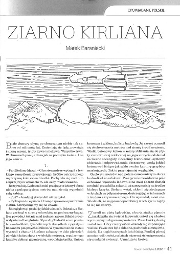 13.1. Рассказ “Ziarno Kirliana/Зерно Кирлиана” написал Марек Баранецкий/Marek Baraniecki (стр. 41—53). Иллюстрации ТОМАША НЕВЯДОМСКОГО/Tomasz Niewiadomski. Рассказ вошел в состав авторского сборника писателя “Głowa Kasandry/Голова Кассандры” (2008).