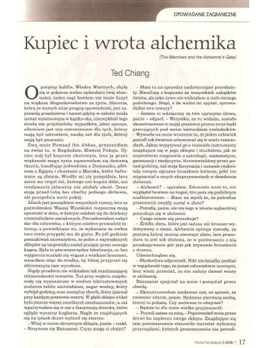 11.1. Рассказ американского писателя Теда Чана/Ted Chang, который называется в оригинале “The Merchant and the Alchemist’s Gate” (2006, ”The Magazine of Fantasy and Science Fiction”, Sept.; 2008, ант. “The Best SF and Fantasy of the Year, vol. 2; 2019, авт. сб. “Exhalation”), перевел на русский язык под названием “Kupiec I wrota alchemika/Купец и врата алхимика” КОНРАД ВАЛЕВСКИЙ/Konrad Walewski (стр. 17—31). Иллюстрации НИКОДЕМА ЦАБАЛЫ/Nikodem Cabała.