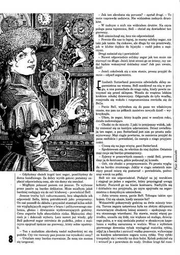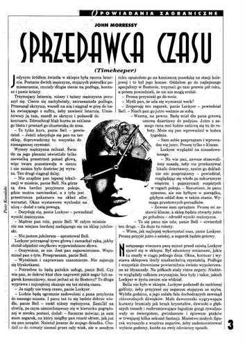 1. Рассказ американского писателя Джона Морресси/John Morressy «Timekeeper» (1990, ”The Magazine of Fantasy and Science Fiction”; 1991, ант. “The Year Best Fantasy and Horror: Fourth Annual Collection”; 2013, ант. “The Mammoth Book of Dark Magic”) перевела на польский язык под названием «Sprzedawca czasu/Продавец времени» СОФЬЯ ДОМБРОВСКАЯ/Zofia Dąbrowska (стр. 3-12). Иллюстрации ПЕТРА КОВАЛЬСКОГО/Piotr Kowalski.