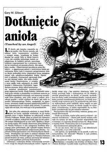 2. Рассказ британского (шотландского) писателя Гэри Гибсона/Gary M. Gibson, который называется в оригинале “Touched by an Angel” (1994, ”Interzone”, # 81, March; 1995, ант. “Shipbuilding”), перевел на польский язык под названием “Dotknięcie anioła/Прикосновение ангела” АРКАДИУШ НАКОНЕЧНИК/Arkadiusz Nakoniecznik (стр. 13-16). Иллюстрации ТОМАША ЛЕНЧИНЬСКОГО/Tomasz Lęczyński.