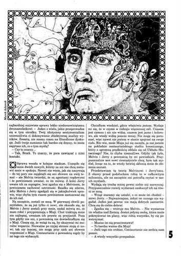 4. Роман американской писательницы Лоис Макмастер Буджолд/Lois McMaster Bujold, который называется в оригинале «Falling Free» (1987, ”Analog”, Dec. и Mid. Dec.; 1988, ”Analog”, Jan. и Feb.), перевела на польский язык под названием «Stan niewolności» АННА ДОРОТА КАМИНЬСКАЯ/Anna Dorota Kamińska (продолжение, стр. 25-40). В номере журнала публикуется третий фрагмент перевода. Иллюстрации АНДЖЕЯ ГЖЕХНИКА/Andrzej Grzechnik.