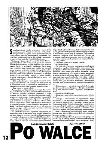 3. Рассказ американской писательницы Лоис Макмастер Буджольд/Lois McMaster Bujold, который называется в оригинале «Aftermats» (1986, ант. “Far Frontiers”; 1995, авт. сб. “Test of Honor”; 1996, авт. сб. ”Shards of Honor”), перевела на польский язык под названием «Po walce/После битвы» ПАУЛИНА БРАЙТЕР/Paulina Braiter (стр. 12-16). Иллюстрации АНДЖЕЯ ГЖЕХНИКА/Andrzej Grzechnik.