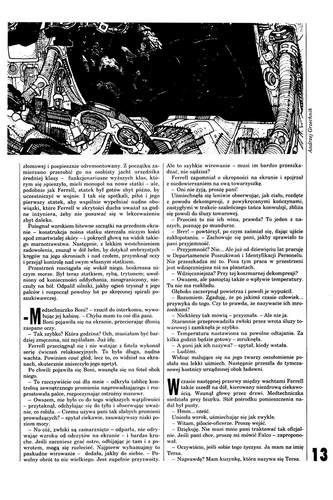 2. Роман американской писательницы Лоис Макмастер Буджолд/Lois McMaster Bujold, который называется в оригинале «Falling Free» (1987, ”Analog”, Dec. и Mid. Dec.; 1988, ”Analog”, Jan. и Feb.), перевела на польский язык под названием «Stan niewolności» АННА ДОРОТА КАМИНЬСКАЯ/Anna Dorota Kamińska (продолжение, стр. 25-40). В номере журнала публикуется четвертый фрагмент перевода. Иллюстрации АНДЖЕЯ ГЖЕХНИКА/Andrzej Grzechnik.
