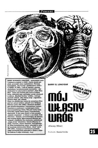 4. Повесть американского писателя Барри Лонгиера/Barry B. Longyear, которая называется в оригинале «Enemy Mine» (1979, ”Isaac Asimov’s SF Magazine”, Sept.; 1980, авт. сб. “Manifest Destiny”; 1998, ант. “The Enemy Papiers”), перевела на польский язык под названием “Mój własny wrog/Мой собственный враг” ДАНУТА ГУРСКАЯ/Danuta Gurska (стр. 25-38, начало). Иллюстрации ПЕТРА ГЕРАСИНЬСКОГО/Piotr Gierasiński.