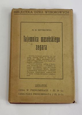 Немного иную тематику затронула Шпыркувна в романе «Тайна масонских часов» (“Tajemnica masońskiego zegara”, 1926), который уже самим названием говорит о том, что вторая (после Налковской) писательница была на пути к тому, чтобы стать вторым (т. е. первой в женском облике) Дэном Брауном. К счастью, дел обстоят не настолько плохо – в случае этого романа современный читатель ассоциирует его скорее с Ненацким. В книге рассказывается о приключених молодого холостяка Ежи, который переезжает из столицы в унаследованный, но изрядно разрушенный дворянский дворец где-то в Кресах. А известно, что на восточных границах Жечи Посполитой всякое порой бывало. Приехав к месту дальнейших событий, Ежи застает там старого слугу, Гжегожа, который знает местные обычаи и тайны семьи и утверждает, что предки Ежи были не только масонами, но и еретиками и якшались с нечистыми силами. Впрочем, не они одни, достается даже местному священнику: «разве тот, кто зелье выращивает и с паскудной гадиной возится, может быть ксёндзом?» Вскоре Ежи начинает исследовать масонскую библиотеку своего прадеда с типично польским именем Гонзага и находит загадочный дневник бабушки, откуда узнает о еще более загадочном исчезновении прадеда и дяди Анджея. Ежи решает разгадать семейную тайну. Кажется, что все нити ведут к двум объектам: полусгоревшей книге, полной странных, смахивавших на сатанинские, символов и текстов, и необычным часам Гонзаги, встроенным в стену бабушкой. Часы уникальные, это барельеф, изображающий человека с циферблатом на голове, вместо цифр на циферблате красуются знаки зодиака, а часы, вдобавок ко всему, начинают ходить лишь перед тем, как в замке совершается нечто плохое, Ежи обнаруживает, что ключом к часам является книга – и вот тут, к сожалению, загадки заканчиваются и начинаются объяснения, причем более рациональные, чем можно было ожидать от автора. Часы содержат в себе сложный механизм, открывающий вход в шахту, ведущую в секретные масонские подземелья. Новый наследник падает в шахту и оказывается в ловушке, а при оказии «обнаруживает своего рода саркофаг Тутанхамона (...), вознесенный на подиум с тремя ступеньками, покрытыми черной тканью с черепом. А на ступеньках (...) три скелета, прикованные цепью к гробу», в котором лежит загадочно пропавший прадедушка Гонзага. Он был великим магистром масонской ложи и поэтому был похоронен тайно, те, кто его похоронили, были прикованы к катафалку, чтобы никогда не выдали тайны.