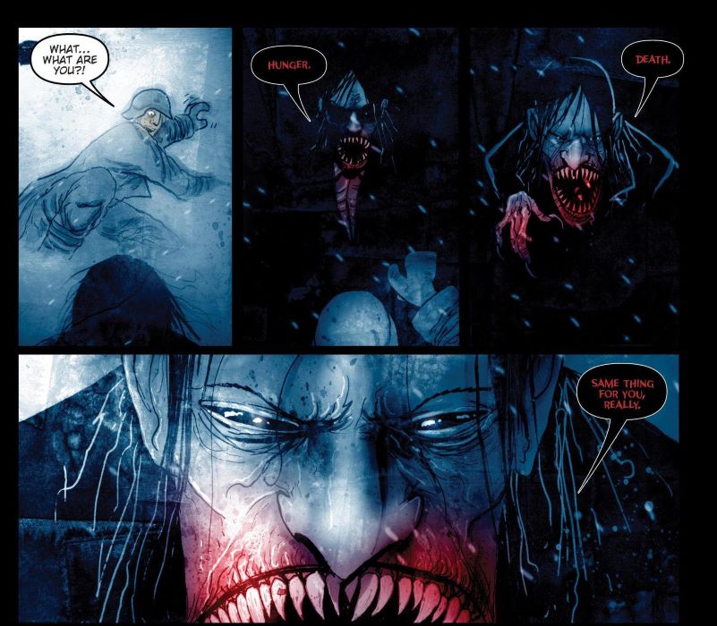 В свою очередь, БЕН ТЕМПЛСМИТ блестяще изобразил Аляску в «30 днях ночи». Используя холодные цвета (в основном синий и серый), обрисовывая контуром фигуры вампиров, терзающих город Барроу, и используя темно-красный «кровавый» цвет для крови, он добился эффекта феерического зимнего ужаса, сравнимого с «Нечто» Карпентера.