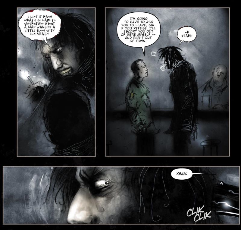 Комикс также может позволить себе быть гораздо более жестоким. В фильмах отдельные сцены длятся несколько секунд и зритель вынужден их воспринимать в таком быстром темпе, что упускает большинство деталей. Аналогично и с книгами, где, скользя взглядом по буквам и представляя себе все эти кишки, кровь и преступления, читателю приходится рассчитывать только на ресурсы своего воображения, а результат оказывается далеким от желаемого. Редко случается вернуться к данному фрагменту текста, чтобы уяснить себе о чем идет речь, а память может быть ненадежной. В свою очередь, комиксы предлагают произвольный темп восприятия, регулируемый исключительно потребителем, который может остановиться на гораздо более длительный (или гораздо более короткий — если у него желудок послабее) промежуток времени, чтобы поразмыслить над устройством внутренностей, полюбоваться анатомическими особенностями чудовища или внимательно осмотреть место преступления, не теряя при этом нити развития сюжета. А если к этому добавить талантливого художника, который любит устраивать впечатляющую презентацию таких элементов (например, САЙМОНА БИСЛИ, преуспевшего в этом в 1990-х годах в ”Lobo/Лобо”