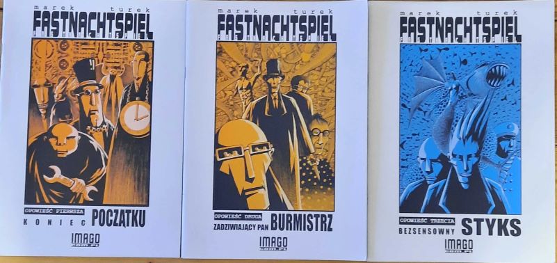 МАРЕК ТУРЕК «Фастнахтшпиль» (Marek Turek “Fastnachtspiel”, 2003-2006) – сложнейшая сюрреалистическая история о Городе, в котором пошатнулись законы физики, искажена перспектива и над которым постоянно висит огромная тяжесть невидимого груза. Горожане наделены гротескными, длинными тенями и бродят по улицам, словно сомнамбулы из культовой кинокартины «Кабинет доктора Калигари».