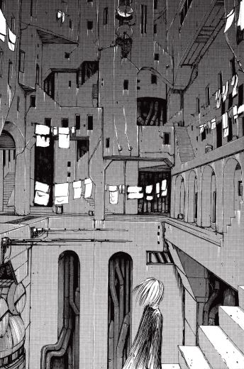 Но и без цвета можно добиться поистине ослепительного «ужасающего» эффекта. Определенно лучше всех это доказывает японец ЦУТОМУ НИХЕИ, сочетающий в своем творчестве киберпанк с «ужасами». Его удивительные видения угнетающих монументальных органических агломераций городов будущего, пересеченных трубами, кабелями и населенных ужасающими генетическими гибридами (“Blame”, “Biomega”), показанные с помощью пятен черного цвета и бесчисленных линий, было бы слишком страшно представить в цвете.