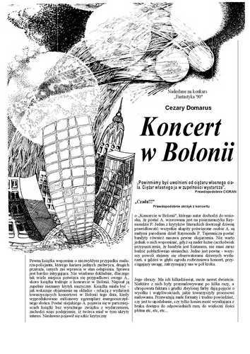 Рассказ “Koncert w Bolonii/Концерт в Болонье” был прислан на III конкурс, объявленный журналом «Nowa Fantastyka», и привлек внимание жюри «необычной атмосферой, абсурдностью описываемых в нем событий и в то же время явственной поэтичностью изображения» (стр. 52 – 56). Иллюстрации ЕВЫ ЛАЩКОВСКОЙ/Ewa Laszczkowska.