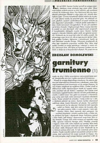 В номере опубликовано также начало повести “Garnitury trumienne/Погребальные костюмы”Здзислава Домолевского/Zdzisław Domolewski (стр. 43 – 56). Иллюстрации МОНИКИ РОКИЦКОЙ. «Домолевский пишет фантастическую прозу, поскольку в ней проще не столько даже формулировать, сколько искать аккуратные вопросы и диагнозы, на которые не хватает места и времени (l’esprit d’escalier) в короткой заметке или беседе. “Garnitury…” возникли из заинтересованности Второй Речью Посполитой, из восхищенного чтения произведений Башевиса Зингера, из ностальгии по той еврейской части польскости, которая определяла атмосферу предвоенной Варшавы и которую поляки себе ампутировали. Кроме этого, мы имеем <здесь> притчу о таинственных связях действительности и фантазии, а также парадоксах литературных предвосхищений» (Мацей Паровский).