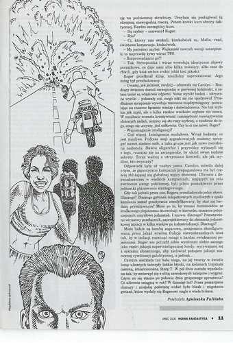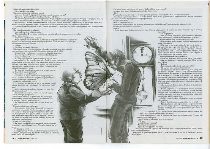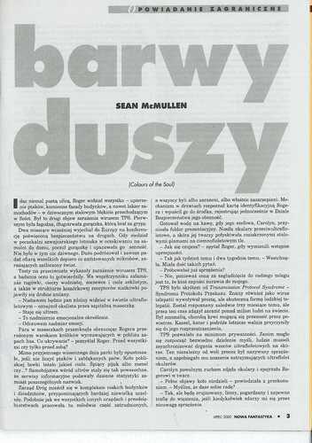 1. Рассказ австралийского писателя Шона Макмуллена/Sean McMullen, который называется в оригинале “Colours of the Soul” (2000, ”Interzone”, #152, Feb.; 2013, авт. сб. “Colours of the Soul”), перевела на польский язык под названием “Barwy duszy/Краски души” АГНЕШКА ФУЛИНЬСКАЯ/Agnieszka Fulińska (стр. 3-11). Иллюстрации МАГДАЛЕНЫ ЕНДЖЕЙЧАК/Magdalena Jędrzejczak.