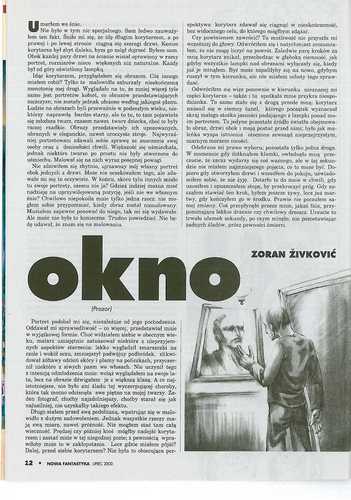 С переводом некоторая неопределенность – возможно рассказ переводился с сербскоязычной рукописи (поскольку в журнале указано именно сербское оригинальное название), но возможно он переводился с английского языка, поскольку был впервые напечатан именно на этом языке в журнале “Interzone” в феврале 2000 года (а затем перепечатан опять же на английском языке в 2001 году в антологии “Year’s Best Fantasy” и в 2006 году – в авторском сборнике рассказов писателя “Impossible Stories”). А если учесть, что в английском журнале встретились оба описываемых рассказа (Макмуллена и Живковича), предположение переходит в ранг почти уверенности...