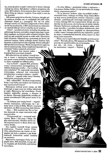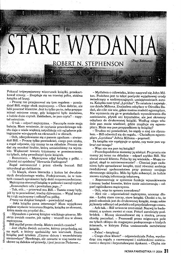 7.3. Рассказ австралийского писателя Роберта Стивенсона/Robert N. Stephenson, который называется в оригинале “Past Editions” (2003, “Nowa Fantastyka”, 11; 2004, авт. сб. “We Would be Heroes: and Other Stories”; 2016, ант. “The Martian Wave”) перевела на польский язык под названием “Stare wydania/Старые издания” МАЛГОЖАТА СТШЕЛЕЦ/Małgorzata Strzelec (стр. 30—36). Иллюстрации МИРОСЛАВА ГОЛЕНДЗИНОВСКОГО/Mirosław Gołędzinowski.