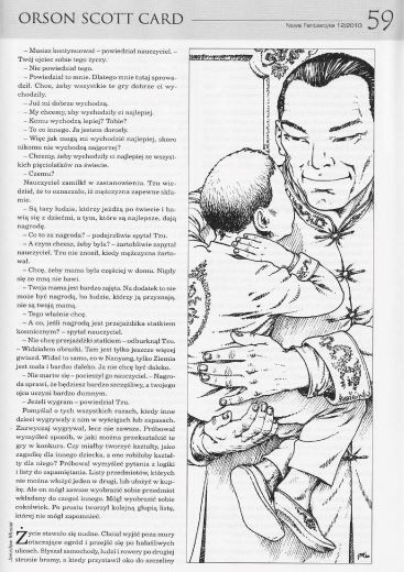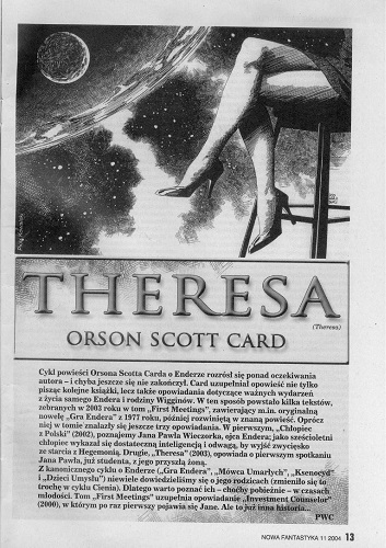 7.1. Рассказ американского писателя Орсона Скотта Карда/Orson Scott Card, который называется в оригинале ”Theresa” (так в журнале, на самом деле “Teacher’s Pest”, 2003, 2004, авт. сб. “First Meetings: In the Enderverse”) перевел на польский язык под названием ”Theresa/Тереза” ПЕТР ХОЛЕВА/Piotr W. Cholewa (стр. 13-25). Иллюстрации ПЕТРА КОВАЛЬСКОГО/Piotr Kowalski.