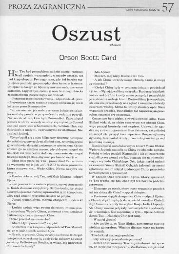 16.2. Рассказ “Cheater” (2008, ант. “O.S. C’s Intergalactic Medicine Show”) перевел на польский язык под названием “Oszust/Обманщик” (стр. 47 – 64). Иллюстрации ЯРОСЛАВ МУСЯЛ/Jarosław Musiał.