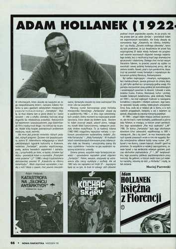 9. Далее следует весьма грустный материал – написанный Мацеем Паровским некролог, посвященный памяти первого главного редактора журнала “Fantastyka/Nowa Fantastyka” (а затем его внештатного сотрудника), известного писателя НФ и популяризатора науки, прозаика-реалиста, поэта, сценариста, мемуариста Адама Холлянека, умершего 28 июля 1998 года (стр. 66-67).