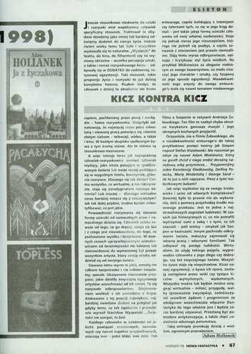 7. В рубрике «Кино и фантастика» Мацей Паровский/Maciej Parowski в статье «Lampa na niebie/Светильник в небе» хвалит фильм режиссера Питера Вейра "Truman Show" (США, 1998) (стр. 57-59), а Бартек Хациньский/Bartek Chaciński в статье «Odyseja złudzeń/Одиссея заблуждений» знакомит читателей журнала с полнометражным фильмом (использующим образы героев и некоторые сюжетные мотивы знаменитого сериала) «The X-Files» режиссера Боба Боумена (США, 1998) (стр. 60-61).