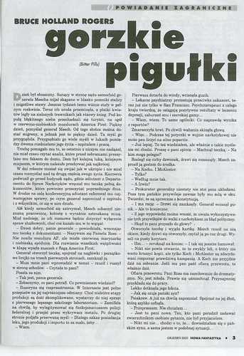 Рассказ американского писателя Брюса Холланда Роджерса/Bruce Holland Rogers, который называется в оригинале “Bitter Pills” (1999, ”Science Fiction Age”, Nov.), перевела на польский язык под названием “Gorzkie pigulki/Горькие пилюли” МАЦЕЙКА МАЗАН/Maciejka Mazan (стр. 3-7). Иллюстрации МАГДАЛЕНЫ ЕНЖЕЙЧАК/Magdalena Jędrzejczak.
