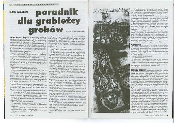 2. Рассказ австралийского писателя Каина Мэссина/Kain Massin, который называется в оригинале “A Guide to Grave-Robber” (2000, ант. “Altair #5”), перевел на польский язык под названием ”Poradnik dla grabieżcy grobów/Пособие для грабителей могил” ПЕТР ГОРАЙ/Piotr Goraj (стр. 8-16; 25-31). Иллюстрации ЭЛИ ВАГИ/Ela Waga.