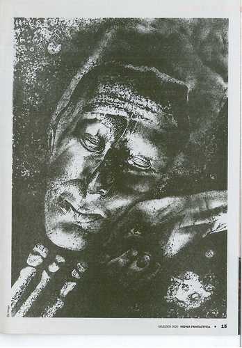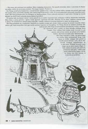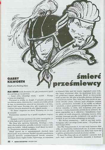3. Рассказ английского писателя Гарри Килворта/Garry Kilworth, который называется в оригинале ”Death of a Moking-Man” (1999, “Interzone”, # 147, Sept.; 2006, 2011, 2018, авт. сб. “Moby Jack and Other Tall Tales”), перевел на польский язык под названием ”Śmierć prześmiewcy/Смерть насмешника” АНДЖЕЙ АППЕЛЬ/Andrzej Appel (стр. 32-39). Иллюстрации АНДЖЕЯ ГЖЕХНИКА/Andrzej Grzechnik.