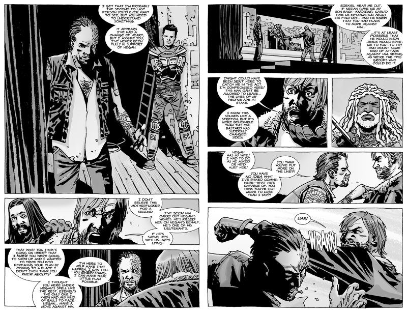 Что стояло за кассовым успехом комикса «Ходячие мертвецы»? Простой и, тем не менее, отсутствующий в большинстве случаев продукции этого типа прием. Киркман сделал ставку на реализм ситуации и задал себе вопрос, на который отвечает и по сей день: что случится, если герои истории про зомби начнут мыслить логически? Что, если они попытаются привить на ствол апокалипсиса черенок ценностей из своей прошлой жизни, а удача им не улыбнется? Таким образом он положил конец видению zombie tales как веселых, сенсационных историй об эффективном уничтожении ходячих мертвецов при попытке сбежать из гипермаркета. Он создал первую настоящую драму ужасов в комиксах, чем возгордился бы и сам Джек Кетчам.