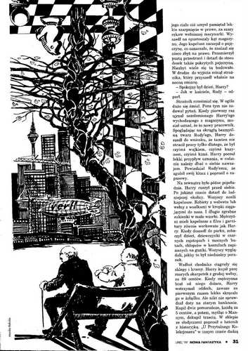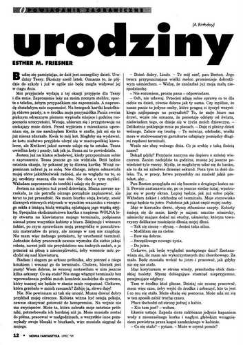 3. Рассказ американской писательницы Эстер Фриснер/Esther M. Friеsner, который называется в оригинале “A Birthday” (1995, “The Magazine of Fantasy and Science Fiction”, Aug.; 1998, ант. “Nebula Awards 32”; 2002, авт. сб. “Death and the Librarian and Other Stories”) перевел на польский язык под названием “Urodziny/День рождения” РАФАЛ ВИЛЬКОНЬСКИЙ/Rafał Wilkoński (стр. 12-16; 25-28). Иллюстрации ПАТРИЦИИ МОРАН/Patrycja Moran.